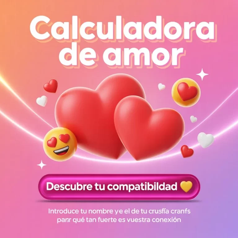 Calculadora de Amor 💖 Descubre la magia de vuestra conexión. ¡Completa los datos y sorpréndete! Nombre 1 Nombre 2 Edad 1 Edad 2 Temperamento 1 — Elige uno —SociableEnérgicoDetallistaEstable Temperamento 2 — Elige uno —SociableEnérgicoDetallistaEstable Interés principal 1 — Elige…